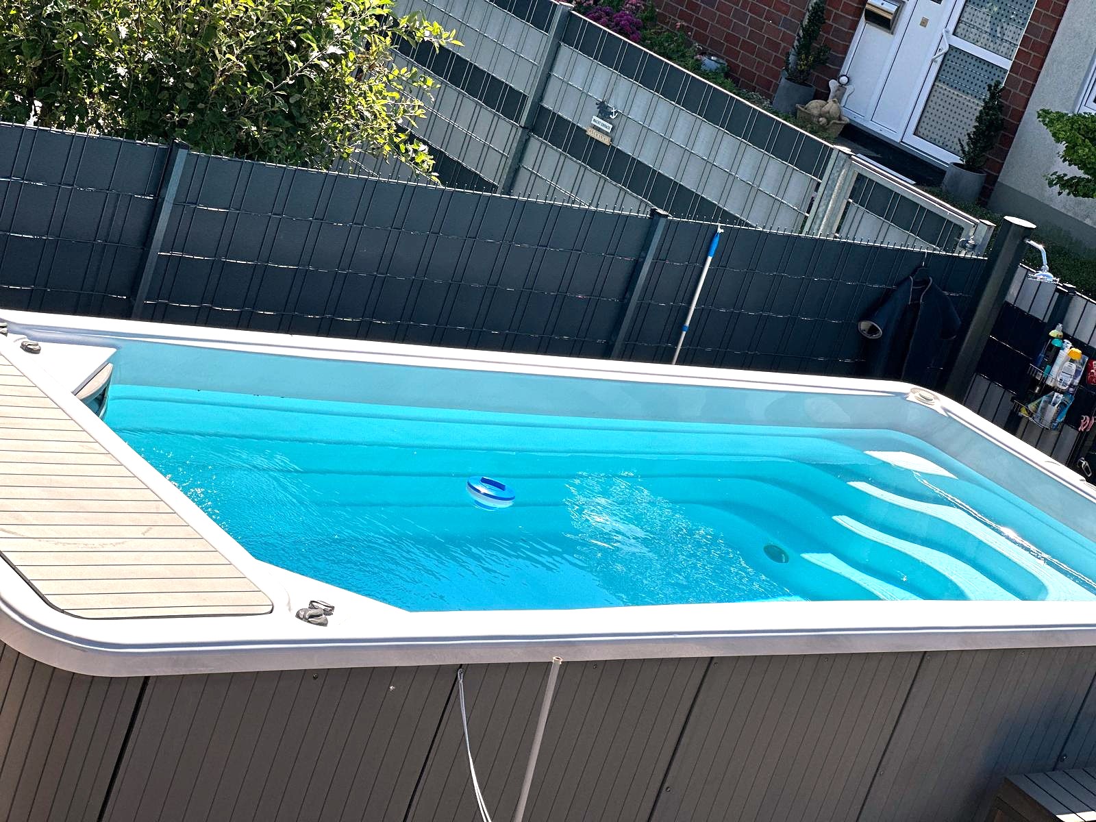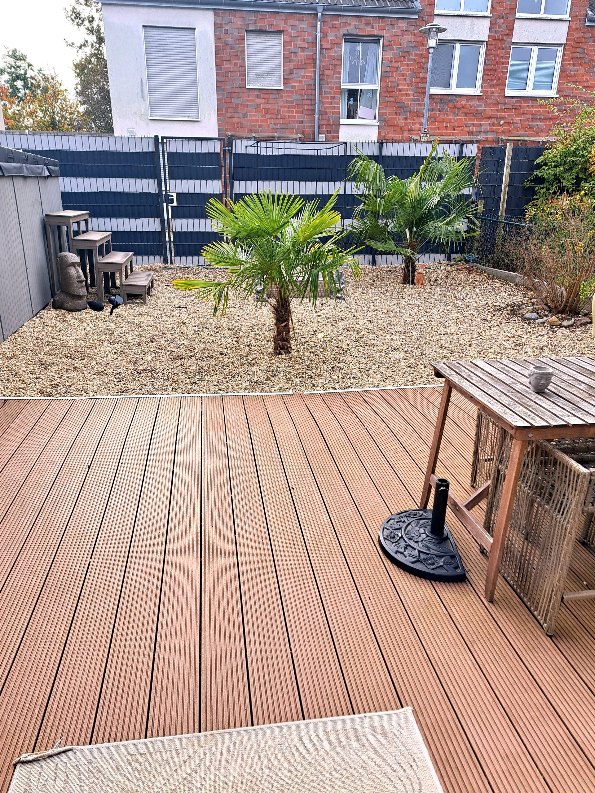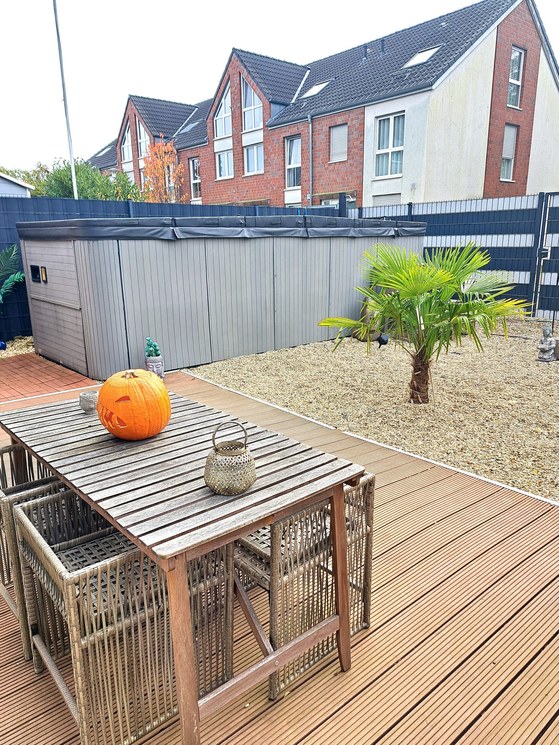 Grundstück: 228,00 m² Gesamtfläche ( Gebäude u. Freifläche ), mit große Terrasse, angelegte Gartenfläche mit Palmen und ein hochwertiger Swim-Spa im Garten zur Abkühlung aufgestellt.